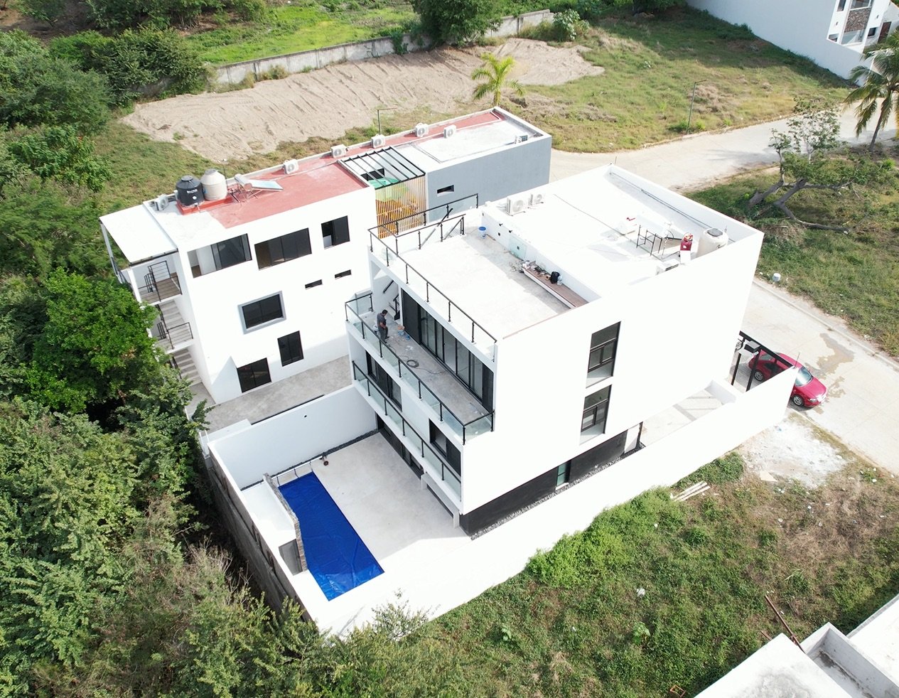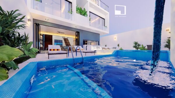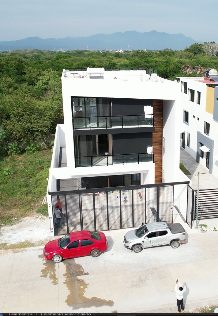 Una vivienda diseñada especialmente para vacacionar; Se trata de un proyecto residencial con aproximadamente 340 m2 de diseño, distribuidos en tres niveles, en el primer nivel encontramos áreas para estar con una terraza enorme y una alberca, en el nivel dos, las áreas privadas para dormitar, y en un tercer nivel una terraza totalmente techada especialmente para el esparcimiento familiar o social, haciendo de esto espacios únicos unidos a través de una triple altura y  rooftop de remate.